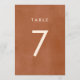 Cartes de numéro de table de mariage en terre cuite douce, faisant partie de notre collection de papeterie mariage d'aquarelle moderne teintée à la trempe. Avec arrière - plan rouille et texte crème.