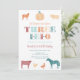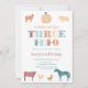 Le vieux MacDonald avait une ferme ! Trois IEIO ! Une invitation de fête de 3ème anniversaire neutre pour un thème de ferme ou de zoo mousseux dans un orange brûlé / terre cuite / couleurs turquoises.