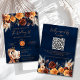 Invitation de mariage moderne et époustouflante avec code QR représentant un couple romantique avec des éléments floraux boho d'herbe de la pampa dans des tons terre cuite, rouille, orange brûlé et cottage d'automne sur un fond bleu marine. Ajoutez l'URL de votre site web de mariage et le code QR sera mis à jour. Cliquez sur personnaliser pour modifier davantage. Une invitation pratique tout-en-un sans avoir besoin d'ajouter des enclos séparés.