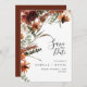 Cette invitation de mariage élégante et naturelle "save the date" présente des fleurs rustiques à l'aquarelle en terre cuite et rouge foncé, des feuilles sèches et des brindilles. Design moderne et tendance.