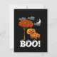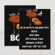 Invitation de fête d'Halloween avec lettrage effrayant, ciel noir avec lune croissante et nuages avec une famille de citrouilles mignonnes debout sous un arbre avec des feuilles d'automne orange. Répétition de tous les graphiques au dos de la carte mais avec un BOO ! mignon et amical avec des yeux ! Pour créer l'ambiance ! Venez si vous l'osez !