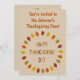 Cette formidable invitation à la fête de Thanksgiving présente une image art numérique d'une série de feuilles de chêne dans les tons rouge, orange, jaune et vert disposés en cercle autour d'un texte avec des lettres alternées de rouge, jaune, orange et vert qui dit Bon thanksgiving Day. Il y a du texte personnalisable à l'avant et à l'arrière pour que vous puissiez personnaliser cette invitation.