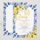The back of the invitation continues the blue tile and watercolor lemon floral design, creating a cohesive and polished stationery set. Easily personalize with your event details to create a memorable and beautifully styled bridal shower invitation.