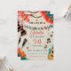 Vibrant, bohemian-chic 14th birthday invitation for "Ophelia," featuring a "Showgirl Birthday" theme with musical elements like a record player and microphone, accented by coral, teal, feathers, and beads.
