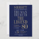His life has been a great adventure! This fabulous navy blue men's 80th birthday surprise party invitation that says "The Man The Myth The Legend" in a classic font in silver and gold would be perfect for asking people to join you as you celebrate the man in your life's 80th birthday. This invitation is trendy, stylish, modern and contemporary. To see your unique invitations select "Personalize this template" and type in your information. It's super easy!