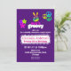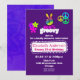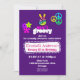 Une invitation d'anniversaire totalement géniale. Décoré d'éléments psychédéliques funky. Un signe de paix fait à la main aux couleurs de l'arc-en-ciel. Fleurs et signes de paix circulaires de style années soixante. Sur fond violet. Un design coloré et cool.