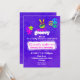 Une invitation à une fête d'anniversaire complètement déjantée. Décoré d'éléments psychédéliques groovy. Un signe de paix fait à la main aux couleurs de l'arc-en-ciel. Fleurs et signes de paix circulaires de style années soixante. Sur fond violet. Un design cool et coloré.