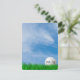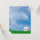 Gros plan d'une balle de golf blanche dans l'herbe verte avec un ciel bleu en arrière-plan pour une invitation de fête d'anniversaire pour tout âge.