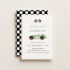 Invitation de fête d'anniversaire sur le thème de la voiture de course rétro. Illustration de voiture de course vert sauge et motif à carreaux en arrière-plan.