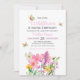 Invitations à la fête d'anniversaire à thème fleur sauvage sucré et estival. Avec de belles fleurs d'aquarelle rose, blanche et jaune et des papillons de couleur pastel.