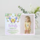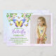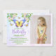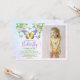 Invitations de fête d'anniversaire de fille à thème papillon doux et estival. Avec un beau bouquet de fleurs d'aquarelle et de papillons pastel, la photo de la fille d'anniversaire en plus de tous les détails de la fête.