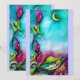 Whimsical, coloré, peinture d'aquarelle artistique avec éclat d'or, petite fille dort entre feuilles roses au feu de lune ( 2009 ).Illustration pour un conte de fées Andersen. Un petit, petit enfant qui est né dans une fleur, qui dormait dans une coquille de noix, qui rampait sur une feuille de tulipe...