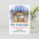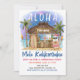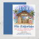 L'invitation à la fête de Noël tropicale met en vedette le Père Noël profitant de vacances dans un bar Tiki sur la plage sous la lune et les étoiles avec des palmiers, des guirlandes de fêtes et des salutations hawaïennes "Aloha" et "Mele Kalikimaka". Des cocktails tropicaux, un ananas, des feuilles d'hibiscus et de palmier, un surfboard et un perroquet avec un chapeau de pirate décorent le bar. Le verso est bleu crépuscule. Œuvre de KL Stock