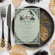 Cet élégant gothique "Til Death Do Us Part" irlandais invitation à la douche nuptiale présente des illustrations à thème irlandais & gothique dessinées à la main à l'encre noire, présentant 2 crânes et une corneille noire ornée de roses verts, feuilles, baies, fleurs sauvages et trèfles verts. Le dos est orné d'un beau motif avec ces éléments. Élégant arrière - plan vert sauge. Tout le texte est modifiable.