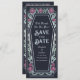 Faites une déclaration audacieuse d'amour éternel. Ce mariage gothique Save-The-Date présente "Till Death Do Us Part" dans un cadre en forme de cercueil, orné d'épines, de roses et d'accents d'argent contre un arrière - plan bleu. Parfait pour une fête romantique ! Personnalisez le texte, la police et la couleur arrière - plan en fonction de vos préférences de conception. Objets correspondants dans notre boutique pour un thème de fête complet. Veuillez noter que l'argent sur les cartes n'est PAS un vrai papier papier et est imprimé en couleurs plates.