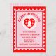 Un timbre-poste vintage inspiré Queen of Hearts et Alice dans le thème d'anniversaire merveilleland conception d'invitation à la fête dans une palette de couleurs rouge vif et rose clair avec des détails de coeur et de fleurs.