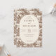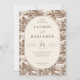 This is a vintage style image featuring an elegant wedding invitation with intricate floral patterns in sepia tones. The oval-shaped design showcases the names "Lauren and Benjamin" prominently, surrounded by charming countryside illustrations that evoke a timeless romance. The warm, inviting tone of the colors creates a nostalgic and sophisticated mood, perfect for couples who appreciate classic charm. It's ideal for setting the stage for a memorable celebration filled with grace and tradition.