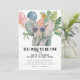 Celebrate a birthday that’s big, bright, and a little bit wild with this playful Too Wild to Be Five jungle birthday invitation featuring a charming watercolor elephant wearing pink sunglasses and a festive party hat. Surrounded by tropical leaves, colorful balloons, and cheerful party accents, this design creates a fun safari atmosphere perfect for a lively birthday celebration.