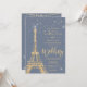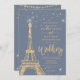 Un mariage à thème parisien moderne, chic et glamour avec une parties scintillant d'or dessinée à la main Tour Eiffel française avec parties scintillant d'or scintille sur éditable bleu poussiéreux. Parfait pour les mariages de destination européenne.