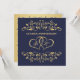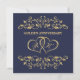 Carton d'invitation pour les 50 ans de mariage avec des tourbillons dorés feuillus et des cœurs unis sur fond bleu foncé. Vous pouvez ajuster le texte en fonction de vos besoins.
