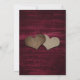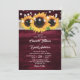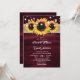 Elégant faire-part de mariage bordeaux et tournesol rustique avec tournesols jaunes et lampes à cordes contre un arrière - plan en bois bordeaux orné de burlap et dentelle. Deux coeurs de burlap à l'arrière.