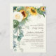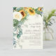 Des tournesols jaunes rustiques mais élégants, des roses blanches, des eucalyptus et d'autres plantes vertes sur une faire-part de mariage botanique couleur crème. Contactez-nous pour obtenir de l'aide sur la personnalisation ou la mise en correspondance de produits. Les noms de la mariée et du marié sont dans une police de caractères élégante.