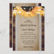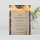 Faire-part de mariage de tournesol rustique avec des tournesols sur un burlap et un coureur de table en dentelle contre un arrière - plan rustique en bois orné de lampes à cordes.