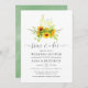 Invitation tendance peinte à la main à l'aquarelle avec tournesols et dégustation de vin pour une fête de fiançailles, une baby shower pour couple ou une répétition de mariage sur fond de lavis vert sauge.