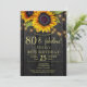Pays rustique fête de quatre-vingts ans modèle d'invitation élégante sur bois de grange brun foncé arrière - plan avec de grands bouquets de tournesols jaune or, cordes de lumières scintillantes et un script de typographie en faux or. ++++++++++++++++++++++ Facile à personnaliser avec vos détails ! Vous pouvez choisir de le customiser en changeant davantage les polices et les couleurs de l'écriture. +++++++++++++++++ L'invitation est adaptée pour jardin extérieur / jardin rustique brunch champêtre / barbecue été ou automne fêtes d'anniversaire