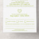 Célébration de 1 an d'anniversaire de mariage d'amour événement avec des photos et des invitations détachables RSVP. Les Invitations peuvent être scellés afin qu'aucune enveloppe ne soit nécessaire. Un gemstone d'art vert de ligne de peridot en forme de coeur imprimé graphisme mariage anniversaire invitations, personnalisez avec vos propres détails de fête d'anniversaire mariage, une photo du couple heureux sur le rabat intérieur. Facilitez l'envoi pour vous et vos invités, car aucune enveloppe n'est requise avec celle-ci, il suffit d'écrire à la main sur vos invitations scellées et vos invités peuvent répondre avec la rsvp détachable, en apposant un cachet pour des réponses des invités encore plus rapides et faciles. Le premier anniversaire du mariage est associé au péridot de pierre gemme et le coeur symbolise l'amour. D'autres articles correspondants sont disponibles. Art graphique et design par Sarah Trett pour www.mylittleeden.com et www.mylittleedenweddings.com