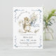 Invitation adorable pour une baby shower aquarelle représentant un petit écureuil tenant un bouquet de fleurs noué avec un ruban et un nœud bleu délicat. Design charmant d'écureuil à l'aquarelle avec des accents d'aquarelle bleue douce, des bordures de ruban élégantes et un texte fantaisiste "Un petit écureuil est en route" – parfait pour les baby showers de genre neutre, garçon ou sur le thème de la nature.
