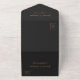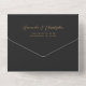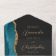 Le bord gauche de cette élégante invitation de mariage et carte-réponse moderne tout-en-un présente une bordure d'agate aquarelle bleu sarcelle rehaussée de fausse paillette dorée. Le texte personnalisable combine une calligraphie stylée dorée et des polices sans empattement sur un fond noir ardoise. L'adresse de retour apparaît sur le rabat extérieur et au verso de la carte-réponse détachable en texte doré sur fond noir ardoise uni.