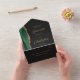 Le bord gauche de cette élégante faire-part de mariage tout-en-un moderne et RSVP est doté d'une bordure en aquarelle vert émeraude, ornée d'une parties scintillant en faux or. Le texte personnalisable combine un script de calligraphie de couleur or et des polices sans serif sur un arrière - plan noir en ardoise. L'adresse de retour apparaît sur le rabat extérieur et sur le côté arrière de la carte RSVP détachable en texte doré sur ardoise solide noir.