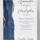 Le bord gauche de cette élégante faire-part de mariage tout-en-un moderne et RSVP est doté d'une bordure en aquarelle bleu marine ornée d'une parties scintillant en faux argent. Le texte personnalisable combine écriture manuscrite grise au fusain, cuivre et polices italiques sur un arrière - plan blanc. L'adresse de retour apparaît sur le rabat extérieur et sur le côté arrière de la carte RSVP détachable en texte gris fusain sur blanc solide.