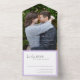Mariage moderne tout en une invitation avec les détails de votre événement sur votre photo verticale préférée avec les mots "la célébration mariage de" dans un script élégant.