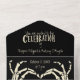 Créez un faire-part de mariage cool déplaisant. Cette invitation tout-en-un a un invitation et une carte RSVP amovible. Il présente une palette de couleurs noir et crème ou ivoire avec une illustration des mains squelettes en forme de coeur qui convient parfaitement aux mariages à thème Halloween ou goth.