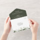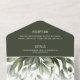 Feuilles de verdure d'aquarelle moderne dans les tons clairs et foncés des invitations de mariage vert forêt. Personnalisez avec vos propres informations. Une combinaison unique d'une invitation personnalisée magnifiquement imprimée avec une carte postale perforée RSVP facile à déchirer. Et ils sont si faciles à utiliser ! Il suffit de plier, puis de sceller le rabat arrière avec les trois autocollants clairs inclus, et le courrier. Et quand vos invités reçoivent votre invitation personnalisé, ils déchirent la carte RSVP perforée et vous la remettent dans le courrier ! *** - NOTE - *** Si vous avez besoin d'aide pour cette invitation ou pour des demandes personnalisées avec lesquelles vous avez besoin d'aide, ne placez pas cette marchandise dans votre panier. Au lieu de cela, envoyez-moi votre demande par courriel à shutterbug600@yahoo.com. Je suis un designer indépendant qui énumère mon travail à vendre par Zazzle; cependant, ils remplissent tous les aspects de la fabrication et de l'expédition de ces conceptions. Je n'ai pas accès à votre compte et je ne peux pas voir ce que vous avez fait. Les réponses à vos questions peuvent être trouvées à l'adresse https://www.zazzle.com/about/ask Cliquez sur le lien pour que les questions concernant votre commande ou expédition puissent être répondues par les merveilleux membres de l'équipe de service à la clientèle de Zazzle.
