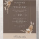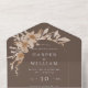 Le tout dans une faire-part de mariage de sauce triplée avec un bouquet de pêche/aquarelle beige floral dans un cadre d'arche moderne sur un arrière - plan marron. combinaison faire-part de mariage, carte rsvp et enveloppe. La carte de réponse est une carte perforée de déchirure rsvp avec choix de repas détaillés.