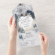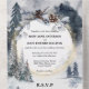 Une belle invitation tout-en-un avec de jolis sapins aquarellés et un feuillage gris argenté au-dessus d'une couronne de feuilles arrondies qui contient de petits cônes de pin brun et des baies bleues qui encadrent des modèles pour votre formulation personnalisée, le tout dressé contre un arrière - plan blanc à l'intérieur et un bleu doux et désespéré à l'extérieur. Le tiers inférieur a une carte de réponse déchirante avec trois options de menu et une adresse rsvp personnalisée pour vos invités à compléter. Elles sont idéales pour les forêts, les forêts, les pays des merveilles d'hiver et le mariage campagnard rustique, fiançailles, anniversaire et des événements d'entreprise.