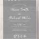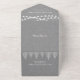 Arbres et lampes à cordes sur papier kraft gris hiver rustique tout en un faire-part de mariage. Il comprend des arbres blancs et des lampes à cordes sur du papier kraft gris. Les noms sont en typographie de script et la déchirure de la carte RSVP peut être détachée.