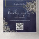 Le tout dans un faire-part de mariage gothique avec des fleurs roses noires et or tombant sur une arche d'or renfermant une élégante typographie sur un arrière - plan bleu nuit. L'invitation comprend une carte RSVP perforée qui contient le code QR de votre site Web mariage et des détails. Conçu par Thisisnotme©
