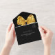 Un arrière - plan noir, décoré d'un grand arc doré. Personnalisez et ajoutez des noms, des détails de parti, la date RSVP, l'adresse et le nom de retour.