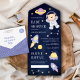 Éblouissez vos invités avec cet invitation de baby shower à thème spatial moderne avec un mignon ours en peluche en costume astronaute et typographie moderne avec carte de tirage de couche détachable. Ajoutez simplement les détails de votre événement sur ce modèle facile à utiliser pour en faire une invitation unique.