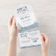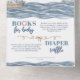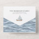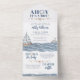 AHOY, C’est un garçon ! Cette invitation à baby shower repliée "All In One" est conçue pour la commodité et le charme, avec un thème nautique dans une belle palette bleue, blanche et bronzée. En haut à l'intérieur, l'invitation principale accueille les clients pour une fête spéciale, avec un charmant voilier bleu et blanc flottant dans un océan serein. Un sauveteur bleu marine, des accents de corde et une mouette perchée sur un rocher complètent l'atmosphère côtière. La section du bas comprend des détails "Livres pour bébé" et "Déchets", ce qui facilite la participation des clients. La partie déchirante au bas sert de carte d'entrée pour la tombola, assurant une touche amusante et interactive. Les fontes bleu marine dans un mélange de serif, de script et de styles modernes ajoutent un look sophistiqué mais ludique. Le fond est agrémenté d'un motif d'eau apaisant avec un détail de voilier, rehaussant le thème nautique. Parfait pour une fête estivale ou toute saison, cette invitation tout-en-un garde tout en harmonie tout en ajoutant une touche spéciale à votre baby shower.