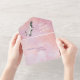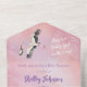 Bébé Fille en Route Cigogne dans le Ciel du Coucher de Soleil. Il y a un beau ciel de couleur aquarelle avec une cigogne portant une petite fille blanche. Tout en une invitation et carte de réponse.