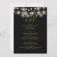 Cet élégant faire-part de mariage noir et or, avec ses jolies lampes à cordes et sa verdure fleurie, peut être personnalisé avec vos informations en typographie chic. Avec toutes les informations spéciales sur le jour de mariage au verso, y compris votre RSVP, l'hébergement, et des détails supplémentaires. Conçu par Thisisnotme©