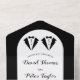 Black and white tuxedo Mr and Mr two grooms gay All in One wedding Invitation. This elegant wedding invitation features a sophisticated black and white design, specifically tailored for a Mr & Mr gay wedding. The primary visual element thoughtfully showcases the upper portion of two gentlemen's formal suits, complete with distinguished bow ties, indicating the attire of the two grooms. The names of the grooms are in script typography. All elements are placed in a white arch with black border. This clear and cohesive design effectively conveys the joyous union and the formal, yet personal, tone of the event.