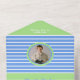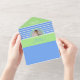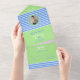 Bleu ⎮ blanc vert All in One Invitation est un mélange parfait de design moderne pour sa fête d'anniversaire avec un thème de rayures, bleu et vert plus un monogramme et une photo pour une touche plus personnalisée.