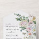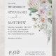 Ces invitations de mariage présentent un design floral moderne aquarelle avec des fleurs, du feuillage et des feuilles d'eucalyptus. Des articles de papeterie correspondants sont également disponibles.