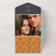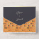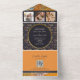 Un tout-en-un moderne et bohème qui respire l'élégance et le charme chic, avec un mélange frappant de tons orange et noir. Personnalisez ce design avec quatre photos personnalisées du couple, capturant votre histoire d'amour dans le style. Inclure votre site Web et votre code QR pour une RSVP facile et des détails supplémentaires. Parfait pour une célébration contemporaine inoubliable.